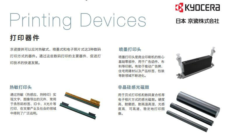 1959年创立的日本京都陶瓷(后简称“京瓷”),主打产品是烧制品中的IC用陶瓷封装。发展到现在,京瓷集团已深入到信息通信、汽车、节能环保、医疗保健等市场,完善了原料、零部件、元件、机器、系统和服务整个供应链。京瓷生产的喷墨打印喷头也是黄瓜网站下载行业的知名品牌。